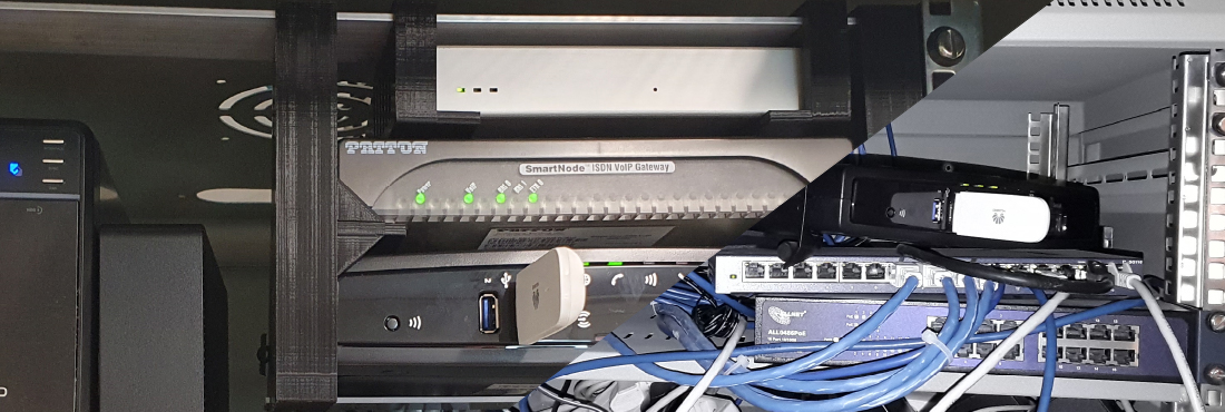 Another design I built, using a 19" mount for a rack tuner, was easily adapted to a rack-compatible support rod. Hanging brackets on an aluminum rod would hold all modems and servers flush with the front. Rubber bands would pull the brackets together, and the devices would be clamped onto them. This even makes it possible to remove the entire mounting device without having to unplug a device. A 2-tier mount was designed for the two modems, which are similar in width. The smaller telephone server received its own mount. The backup server on a Raspberry Pi has its own mount on the left rack rail. The rack mount and the lower shell of the Raspberry Pi case were adapted for this purpose.