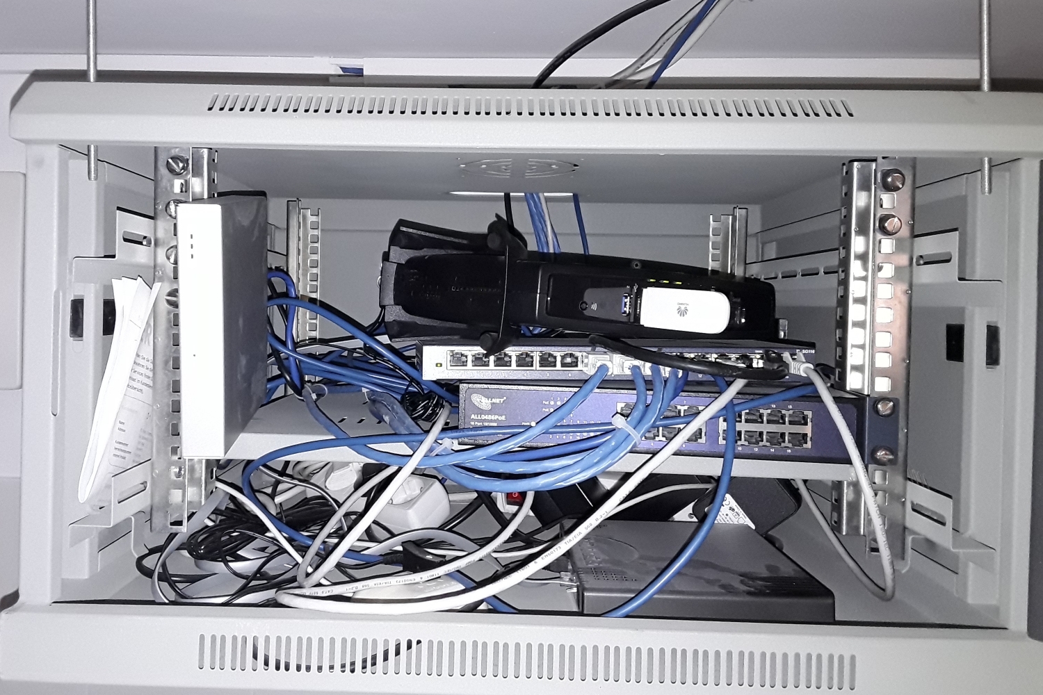 While a customer's server cabinet had every option for installing 19-inch rack hardware, the business internet and telephony solutions offered to small and medium-sized businesses usually include the same modems and servers as those offered to private customers. Not that it's technically necessary to install larger devices here, the biggest problem for me is that consumer modems are often overly sleek and difficult to stack.